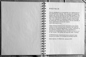 "This us cookbook is an introduction to a special kind of the US*American cooking. The recepies are created by people who were sentenced to the death penalty in the state of Texas and the menus were served to them as their final meal directly before they were electrocuted. This is an example of a growing number of final meals at Texas jails.“